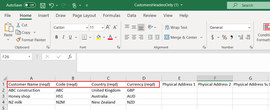 Follow the steps, download/open the template, and then add or copy your data (in this case, Customer data) into the spreadsheet. Note that only the required fields identified in the template need to include data, the rest can remain blank if the information is not available: