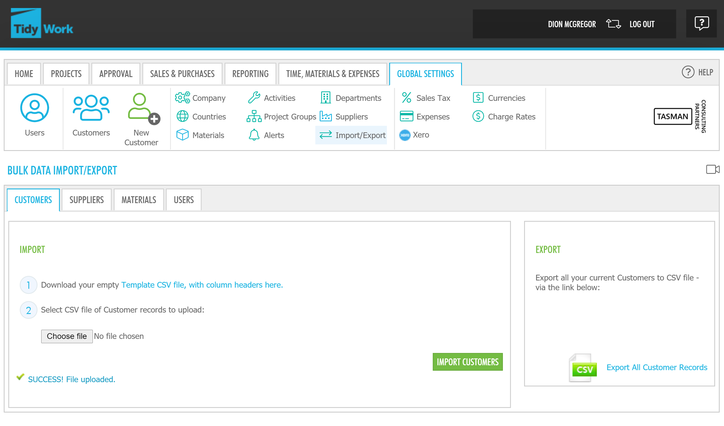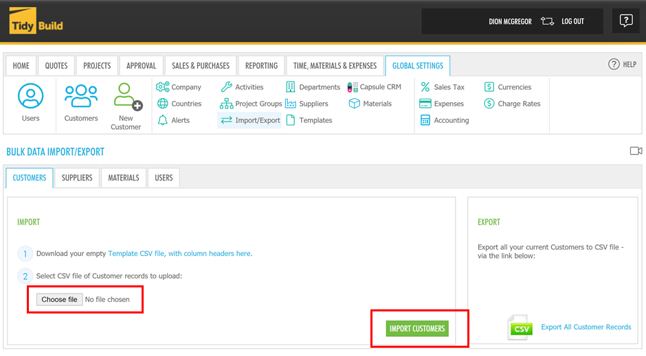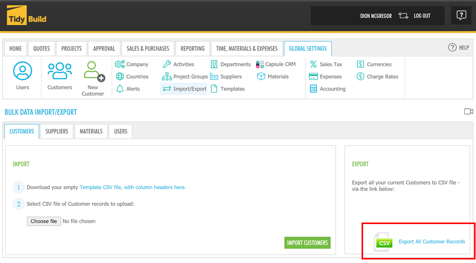 To import customers into TidyBuild, click on the Import/Export option in your Global settings. You will see the CUSTOMERS tab.