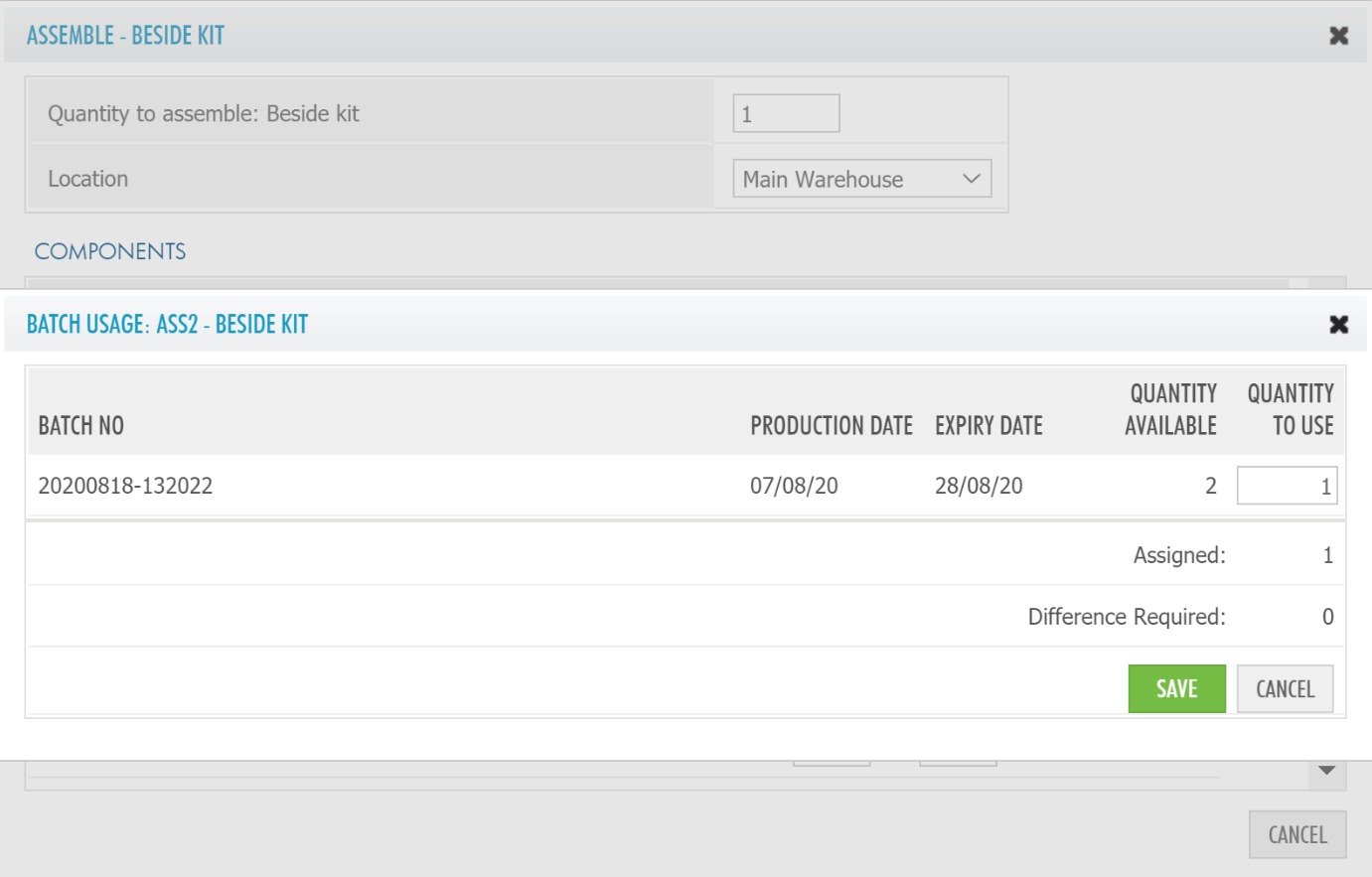 If Batches are not enabled for an Assembly but a component has a batch number, then step 1 (assigning an input batch) as above applies. Step 2, assigning the output batch, is not required.