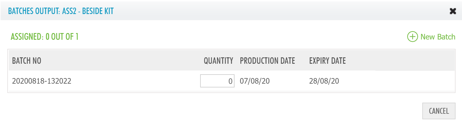 Open the Assemble modal, any line items that have batches enabled display a Batches icon. The icon will initially be red indicating Batch Numbers need to be assigned.