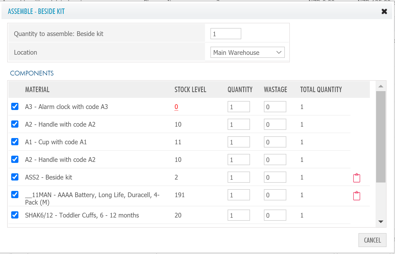 Open the Assemble modal, any line items that have batches enabled display a Batches icon. The icon will initially be red indicating Batch Numbers need to be assigned.
