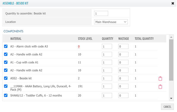 Open the Assemble modal, any line items that have batches enabled display a Batches icon. The icon will initially be red indicating Batch Numbers need to be assigned.